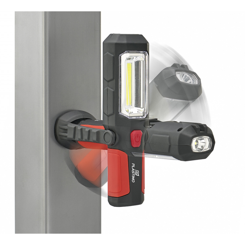 Luce da lavoro supporto dell’inclinazione magnetica per stabilizzare e inclinare la luce. Gancio di sospensione per appenderla a vari supporti. Magnete sul retro per ancorarla a parti metalliche. Luminosità 200 lumens per una visibilità massima indicativa di 30 mt. Peso di 170g senza batterie.Protezione dall’acqua IPx3. Modi d’uso: 1) Torcia 2) Spot