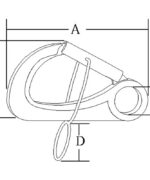 Moschettone in acciaio inox AISI 316, per aggancio e sgancio dai gavitelli di ormeggio. Dimensioni mm. A=108 B=63 C=21 D=35. Carico di rottura 395 Kg.
