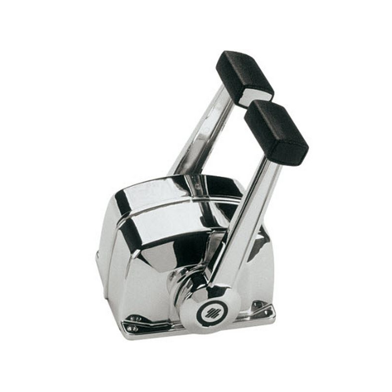 Scatole di comando versione bileva per due motori ad azione doppia per il controllo del gas e dell’invertitore. Adatte a qualsiasi tipo d’imbarcazione con motore fuoribordo, entrobordo e gruppi poppieri provvisti d’invertitore idraulico. Rendono più facile e sicura la guida evitando automaticamente I’innesto dell’invertitore se il gas non é al minimo. Sono realizzate in alluminio pressofuso, verniciate o cromate. Tirando fuori la leva si disinnesta I’invertitore durante I’operazione di riscaldamento del motore. Mediante I’interruttore di sicurezza X12 (optional), I’avviamento del motore si ottiene solamente con I’invertitore in posizione di folle. I modelli con trim presentano nell’impugnatura un interruttore che permette la regolazione dell’alzo piede dei motori fuoribordo e nei gruppi poppieri. Utilizzano i cavi per il comando motore C2-C8-C14 e Mach 0-14. Con il cavo C5-C16 e Mach 5 occorre il kit di adattamento K35 art. 4242069.