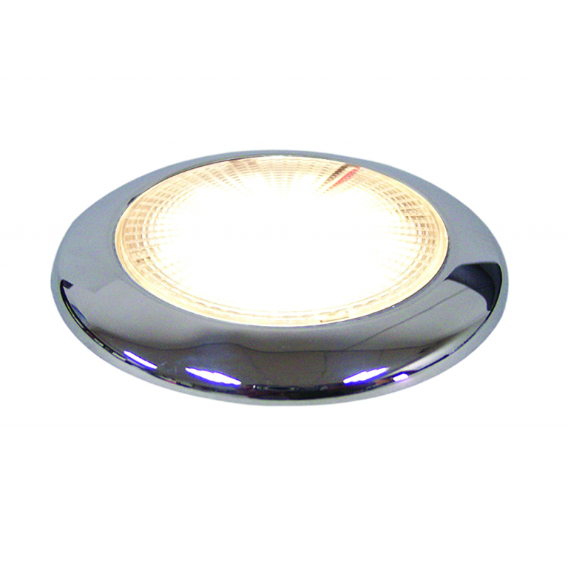 Plafonierain acciaio inox a 16 LED. Montaggio a filo con viti situate sotto il diffusore. Alim. 12V. Consumo 2,5W,illuminazione equivalente a 30W standard. IP66. Luce bianca calda (2900-3200°K) 207 lumen. Dim. Ø mm. 94x11h.